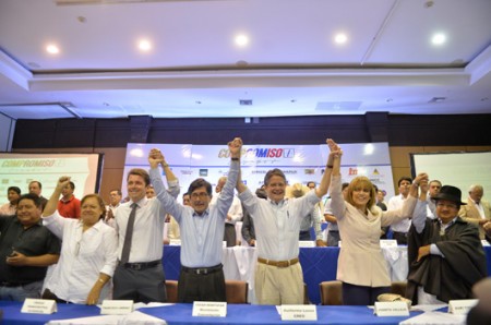En el frente una gran mesa directiva, dispuesta en tres filas, a manera de gradas, los esperaba. Allí se sentaron; en la primera línea se ubicaron los antes mencionados. “No es una alianza preelectoral por una candidatura sino por la consulta popular”, aclaró la maestra de ceremonias. Entre el público la gente levantaba carteles con el número 73%, en referencia a una encuesta que aseguraba que ese es el porcentaje de ciudadanos que quiere un referendo sobre la reelección indefinida.