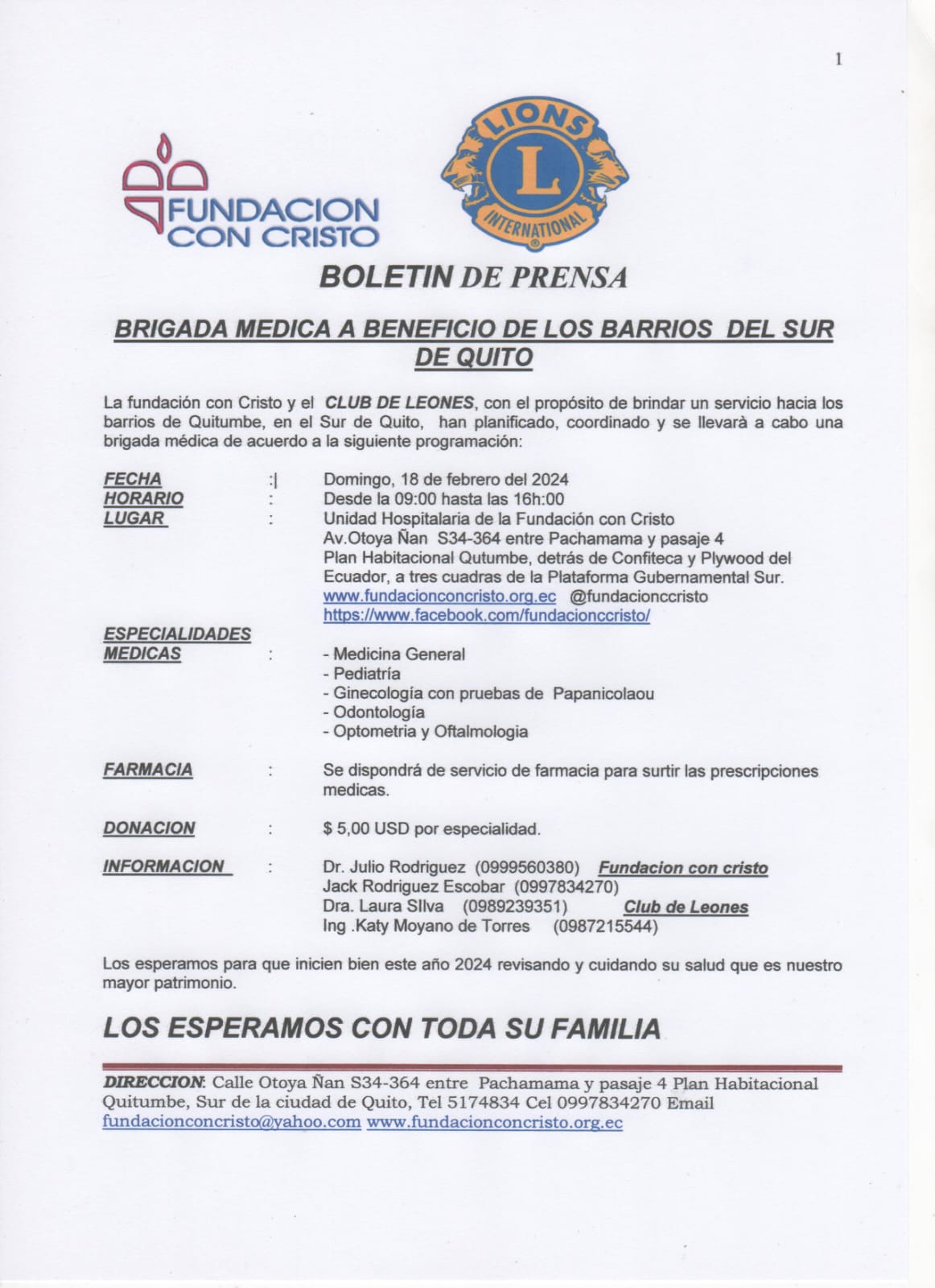 Quito DM. Jueves 15 de febrero de 2024. La Fundación con Cristo y el Club de Leones llevarán a cabo atención de salud en los barrios del sur de Quito, a través de una Brigada Medica, previsto para este domingo 18 de febrero, de 09h00 a 16h00, en la Unidad Hospitalaria de la Fundación CC. de la Av. Otoya Ñan, sector Plataforma Sur.