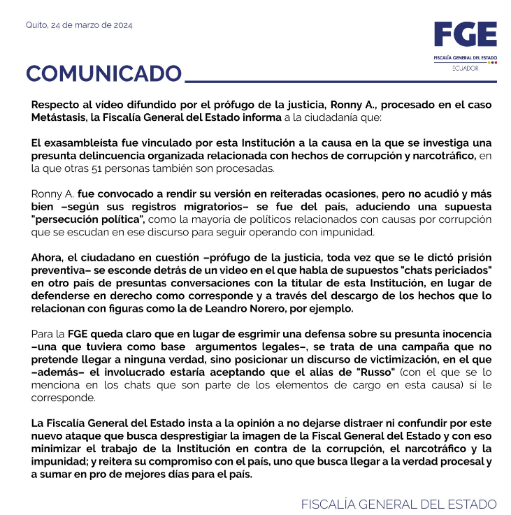 No obstante, la fiscal Diana Salazar desmintió esta información difundida por alias ‘Russo’, como es identificado Aleaga en los chats del caso Metástasis expuestos por el Ministerio Público.
